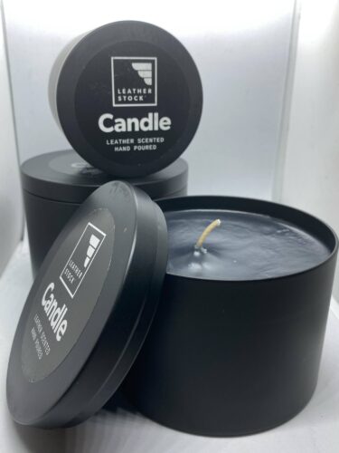 Our new candles are crafted with premium paraffin, carefully hand poured into durable, travel-friendly brushed black aluminum tins. Light one or more to scent your room with our decadent true-leather aroma. Burns for hours and hours. They’re fantastic!